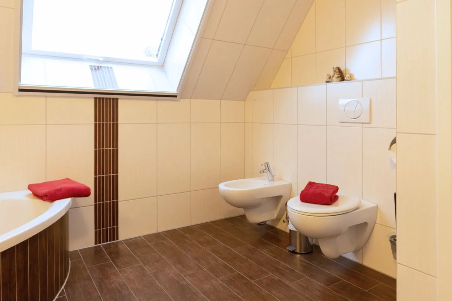 Das Badezimmer bietet neben einer bodengleichen Dusche auch eine Badewanne und ein Bidet, sodass Sie zwischen einem entspannenden Bad oder einer erfrischenden Dusche wählen können.