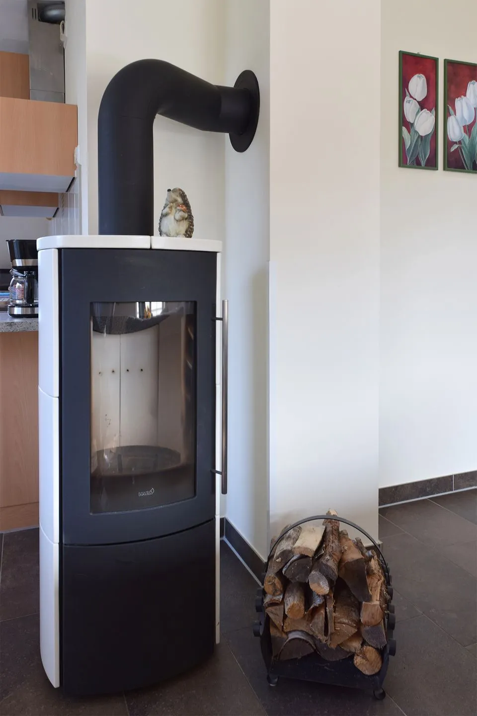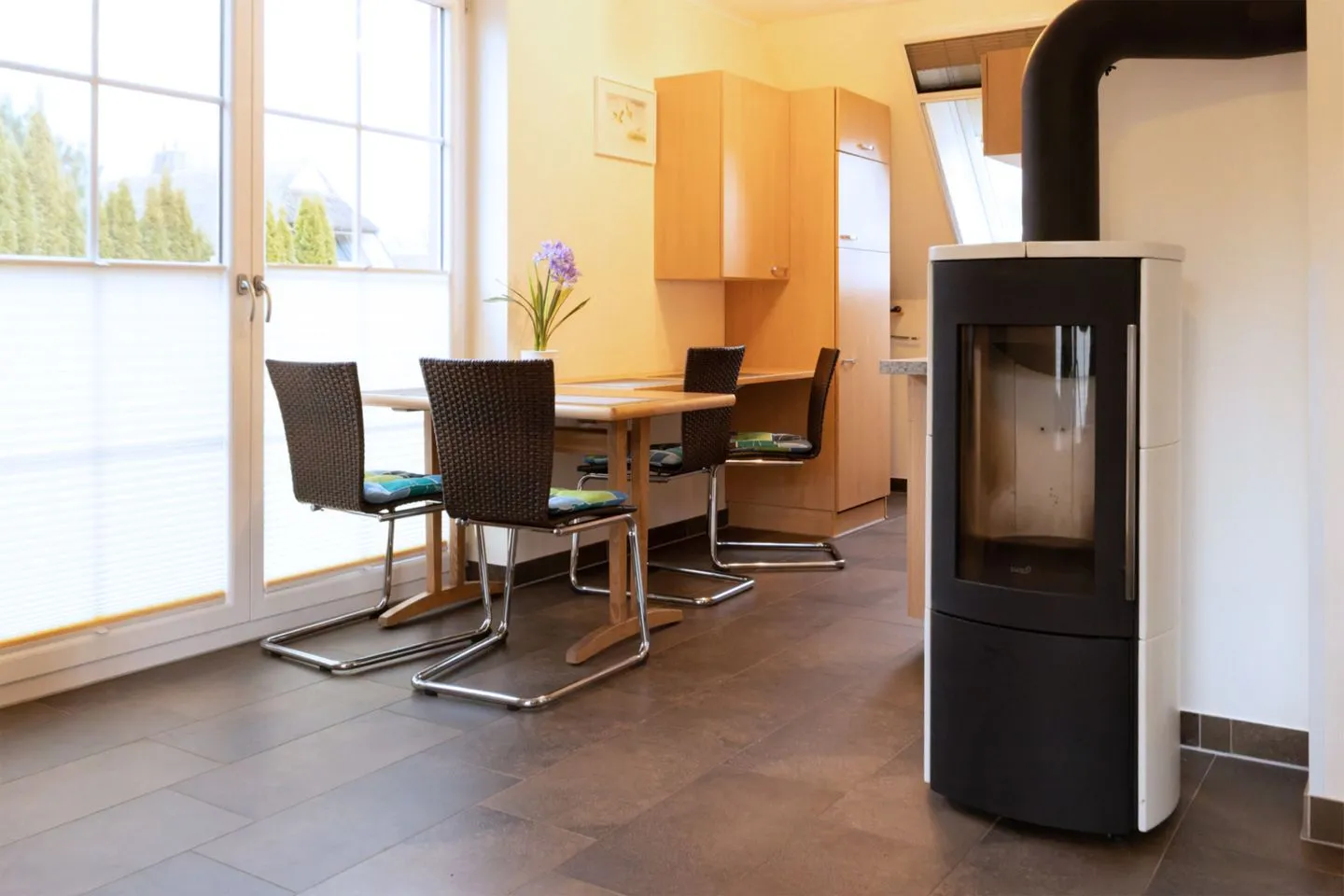 Ein besonderes Wohlfühlmerkmal stellt der Kaminofen dar, der an kühleren Tagen für behagliche Wärme sorgt. Zusätzlich garantiert die moderne Fußbodenheizung, die über eine effiziente Wärmepumpe betrieben wird, eine gleichmäßige Temperierung der Wohnräume.