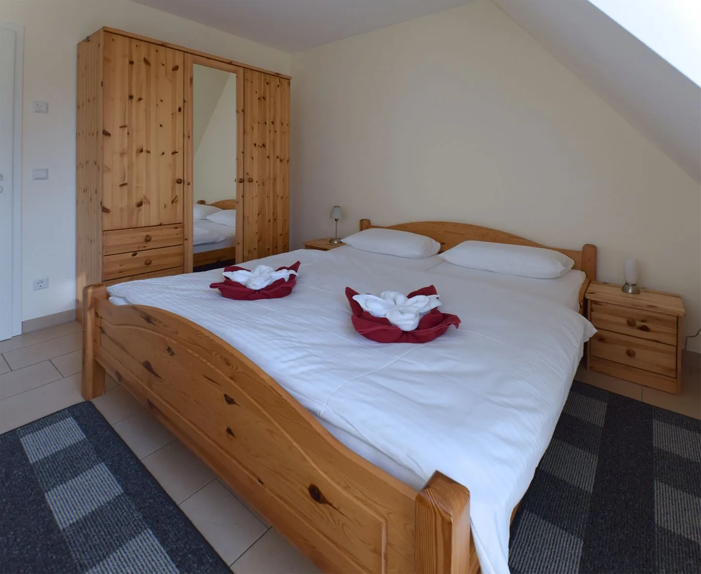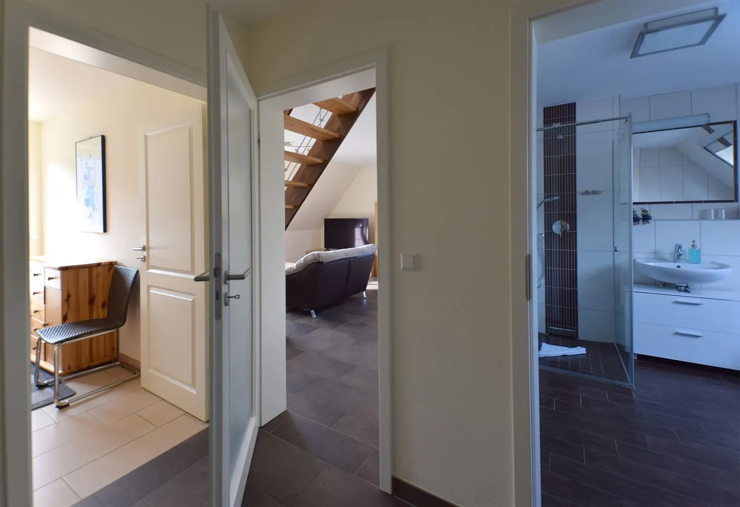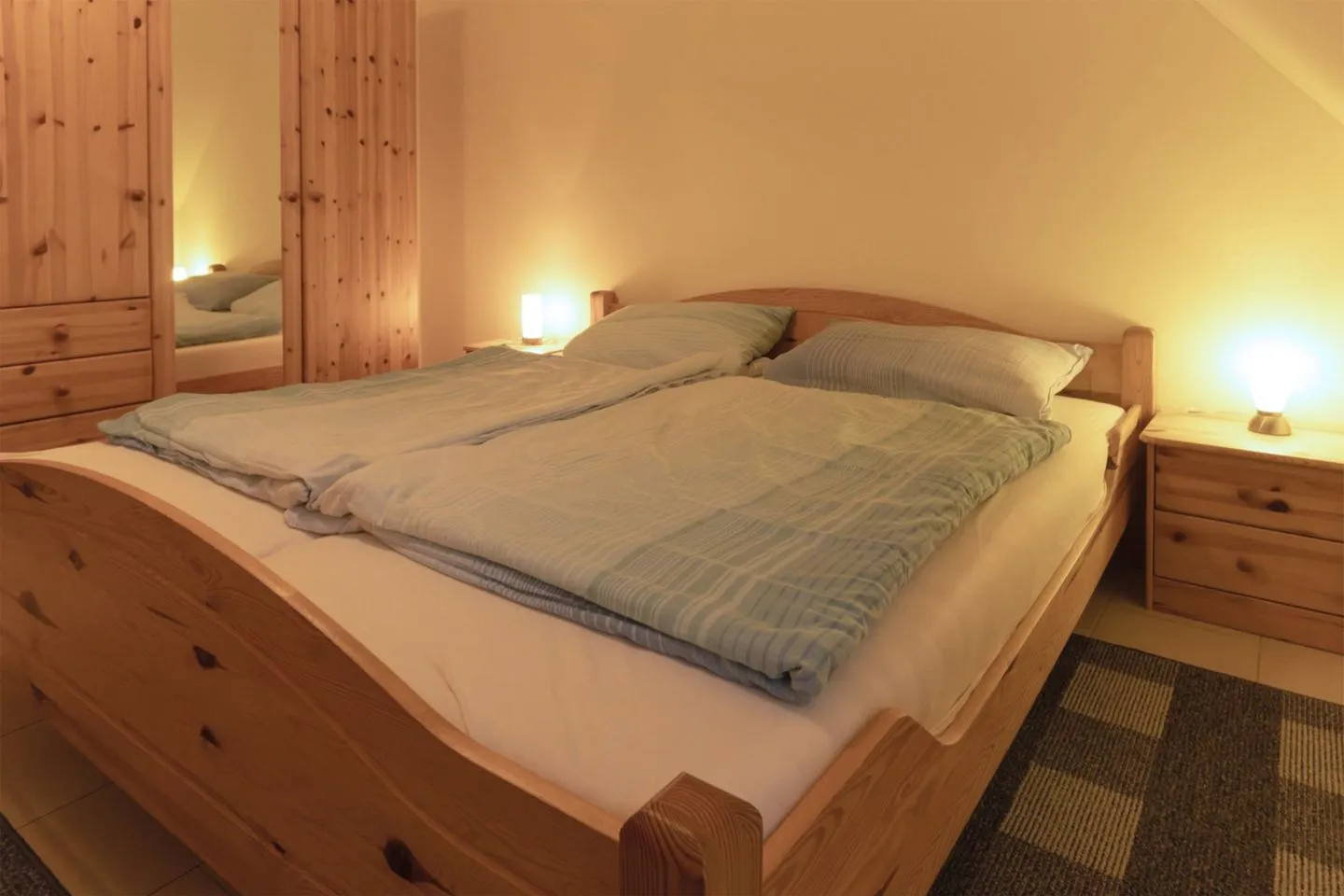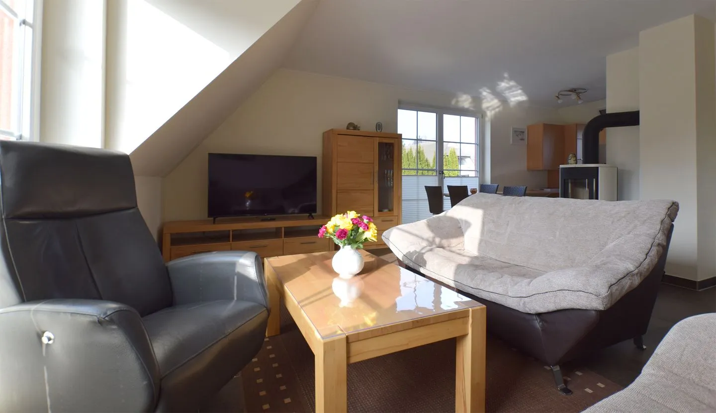 Die modern ausgestattete Ferienwohnung ist ideal auf die Bedürfnisse von Familien und Paaren zugeschnitten. Sie verfügt über zwei Schlafzimmer, wovon sich eines im Obergeschoss befindet und das zweite in der offenen Galerie im Dachgeschoss. Das große, lichtdurchflutete Wohnzimmer schließt eine einladende Sofaecke und einen gemütlichen Sessel ein. Ein Flachbildfernseher mit Satellitenanschluss sowie kostenfreies WLAN sorgen für mediale Unterhaltung und flexible Kommunikation.