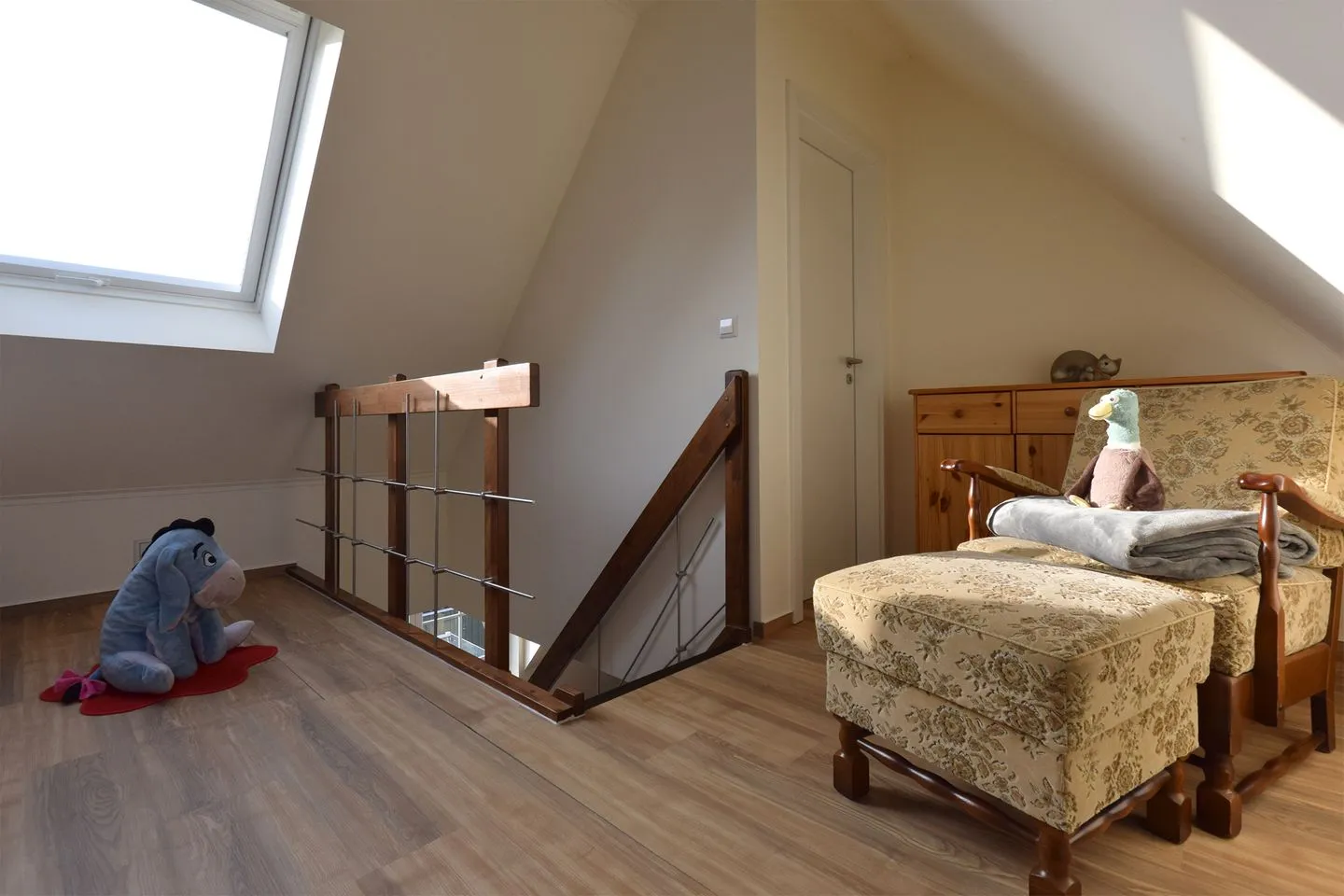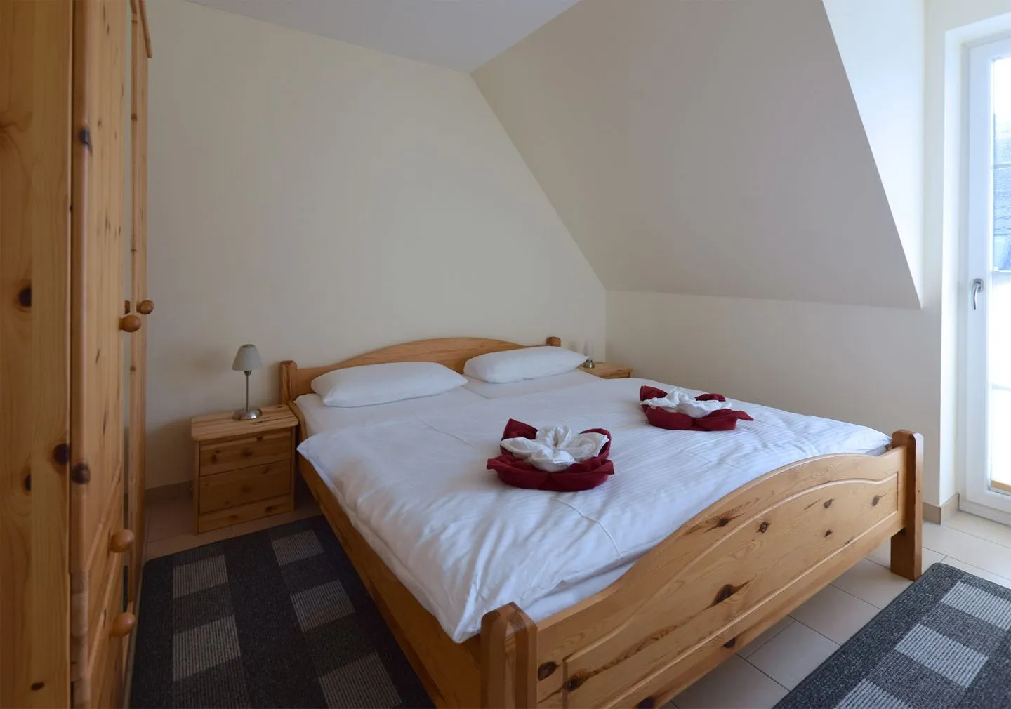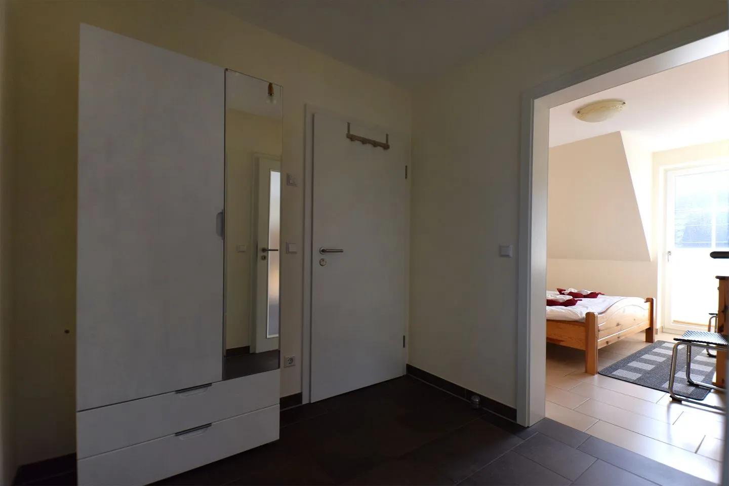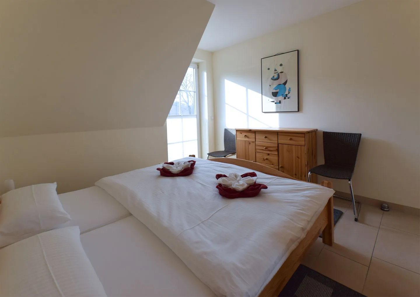 Die modern ausgestattete Ferienwohnung ist ideal auf die Bedürfnisse von Familien und Paaren zugeschnitten. Sie verfügt über zwei Schlafzimmer, wovon sich eines im Obergeschoss befindet und das zweite in der offenen Galerie im Dachgeschoss. Das große, lichtdurchflutete Wohnzimmer schließt eine einladende Sofaecke und einen gemütlichen Sessel ein. Ein Flachbildfernseher mit Satellitenanschluss sowie kostenfreies WLAN sorgen für mediale Unterhaltung und flexible Kommunikation.