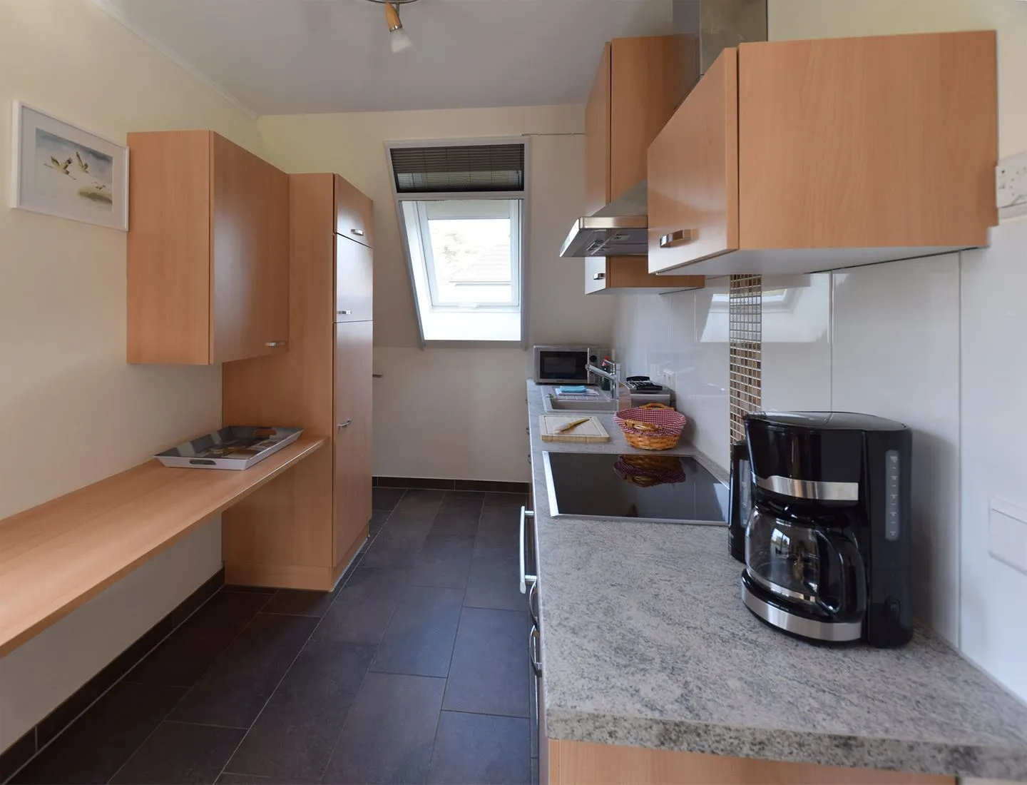 Die offene, komplett ausgestattete Küche schließt sich harmonisch an den Wohnbereich an und bietet einen Ceranherd, einen Backofen, einen Kühlschrank mit Gefrierfach, Spülmaschine, Mikrowelle sowie eine Vielzahl an Küchenutensilien. Kaffeemaschine, Wasserkocher und Toaster stehen ebenfalls bereit. Der Essplatz eignet sich für gesellige Familienmahlzeiten und gemütliche Abende.